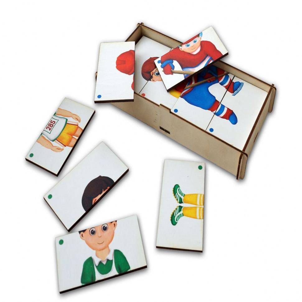 Игровой набор «Составные картинки. Спорт-2»интересная обучающая игрушка изготовлена из дерева. • Игрушка изготовлена из качественных материалов с безопасными красителями. • Изготовлено из безопасных для детей от 3 лет материалов. • Упаковка: пакет Особенность: Название изготовлена из дерева – экологически чистого и гипоаллергенного материала. В комплект входит: деревянный ящик для хранения картинок с крышкой – 1 шт., составные картинки 6 шт. с изображением людей разных спортивных направлений. Каждая картинка поделена на четыре части. Чем полезны составные картинки? 1. Развитие мелкой моторики. Сопоставляя части картинки друг с другом, ребенок прекрасно тренирует пальчики. 2. Ребенок учится ориентироваться на плоскости, собирая картинки. 3. Развитие логического мышления, зрительной памяти, внимания и усидчивости. 4. Развитие креативности и самостоятельности. 5. Очень эффективны картинки в становлении у малыша наглядно-образного мышления. 6. Уяснение понятий части и целого. 7. Формируется зрительно-двигательная координация и пространственное восприятие. 8. Понимание об окружающем мире, развитие речи. Правила: Для начала соберите картинки сами, расскажите, кто на них изображен, задавайте в процессе наводящие вопросы, загадывайте загадки про изображённых людей, а именно про те виды спорта, которые они представляют. Рассказывайте, чем занимаются люди на картинках. Затем предложите ребёнку собрать почти готовую картинку, добавив самостоятельно одну деталь, потом с каждым разом усложняйте задание: две детали, три – в итоге ребёнок не просто должен самостоятельно составить картинку, но и выбрать из перемешанных частей необходимые. Самый сложный вариант – когда перемешаны все 18 вариантов картинок. Для этого вам необходимо приобрести все три выпуска составных картинок. Или полный выпуск №4. В какие еще игры можно поиграть с данным дидактическим материалом? Нарисуйте ипподром. Пусть по нему скачут лошадки. Или каток для фигуристки. Теннисные мячики для теннисистки. Чем отличаются теннисные мячи от футбольных мячей? 1. «На какую букву начинается». Загадайте какое-то одно спортивное направление. Например, теннис. Разложите шесть вариантов картинок. Предложите ребенку угадать выбранный вами спорт по первой букве в названии этого вида спорта. «Мой вид спорта начинается на букву т. Что это?» Правильно теннис. Эта игра тренирует фонематический слух. 2. «Что умеет делать?» Похожая игра, только здесь мы рассказываем о том, что умеет делать человек, того вида спорта, который мы загадали. Например, хорошо катается на коньках? Конечно же фигурист или фигуристка. Угадал. Загадки о видах спорта и спортсменах.